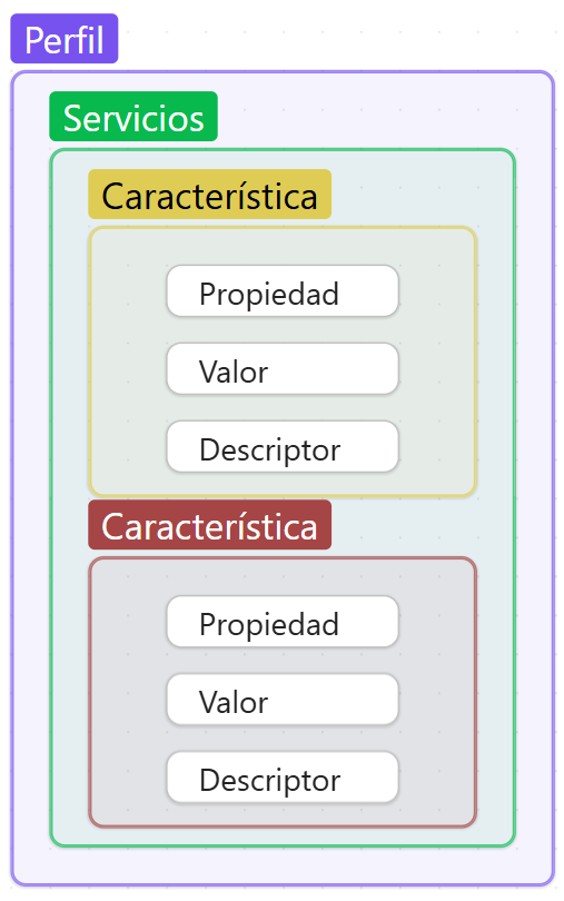 - Características: Es el nivel donde reside el valor real del dato (el mensaje o la medición) Siempre pertenece a un servicio y consta de dos partes principales: la declaración de la característica (metadatos) y el valor de la misma. Además, las características definen sus propiedades, que determinan cómo se puede interactuar con el dato, permitiendo operaciones como: